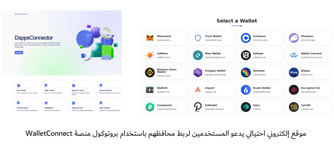 وربما تلجأ المواقع الاحتيالية إلى إساءة استخدام منصة WalletConnect، وهي بروتوكول مفتوح المصدر يتيح للمستخدمين ربط محافظ العملات المشفرة بأمان مع تطبيقات خارجية (التطبيقات اللامركزية dApps) باستخدام رموز الاستجابة السريعة (QR codes)، وبذلك يسهل عليهم التفاعل مع خدمات سلسلة الكتل. وفي حالات كهذه يُطلب من المستخدمين ربط محافظهم بحجة استرداد رسوم الغاز، فيقعون ضحية الخداع ويوافقون على معاملات خبيثة تسرق أموالهم أو تكشف معلومات حساسة.