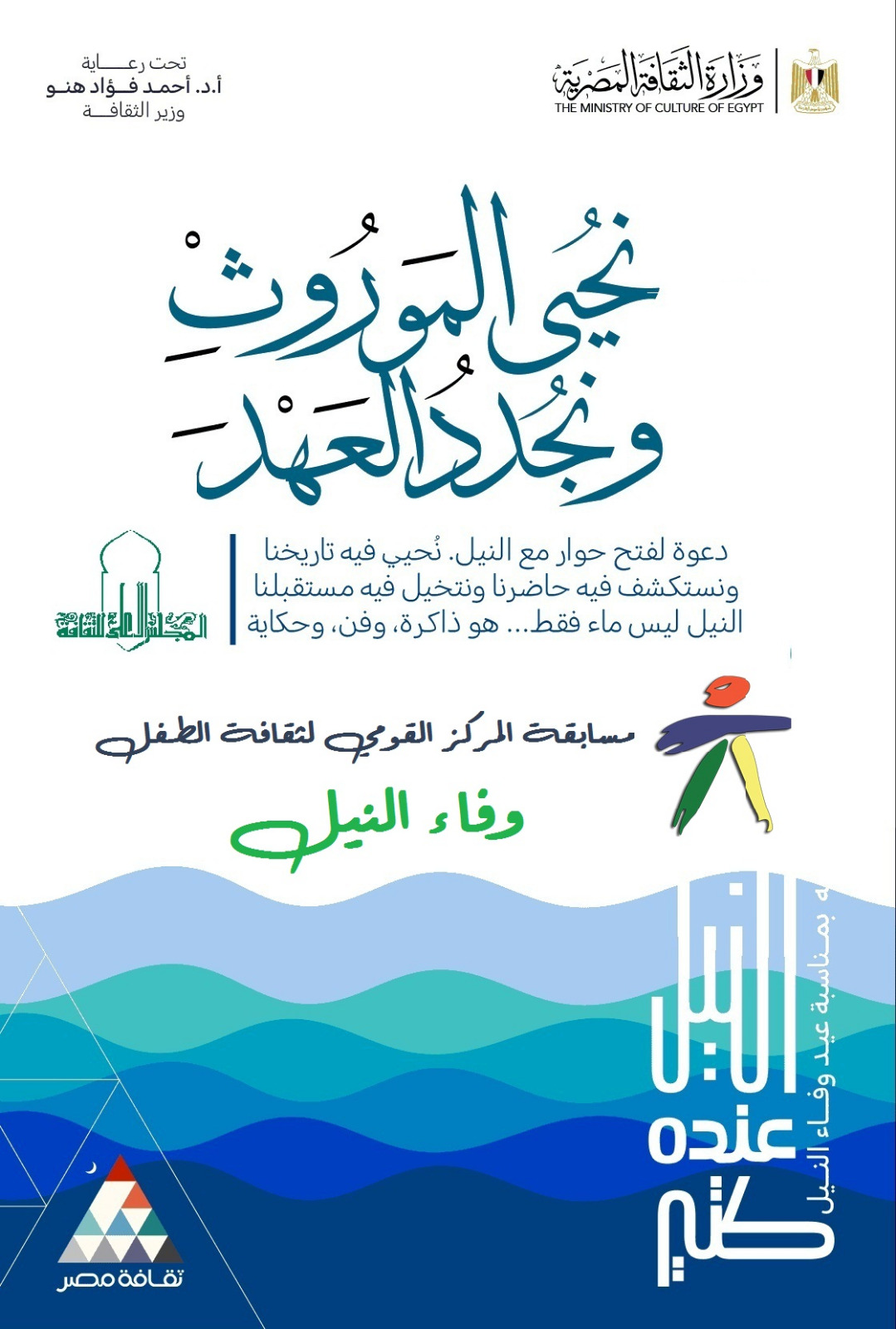 تحت شعار “النيل عنده كتير.. لعزة الهوية المصرية”، تُطلق وزارة الثقافة بالتعاون مع وزارتي الموارد المائية والري والبيئة، مسابقة “وفاء النيل”،التي ينظمها المركز القومي لثقافة الطفل التابع للمجلس الأعلي للثقافة للأطفال والشباب من عمر “8 إلى 18 سنة”، لتشجيعهم على التعبير عن حبهم للنيل من خلال الفن والإبداع.