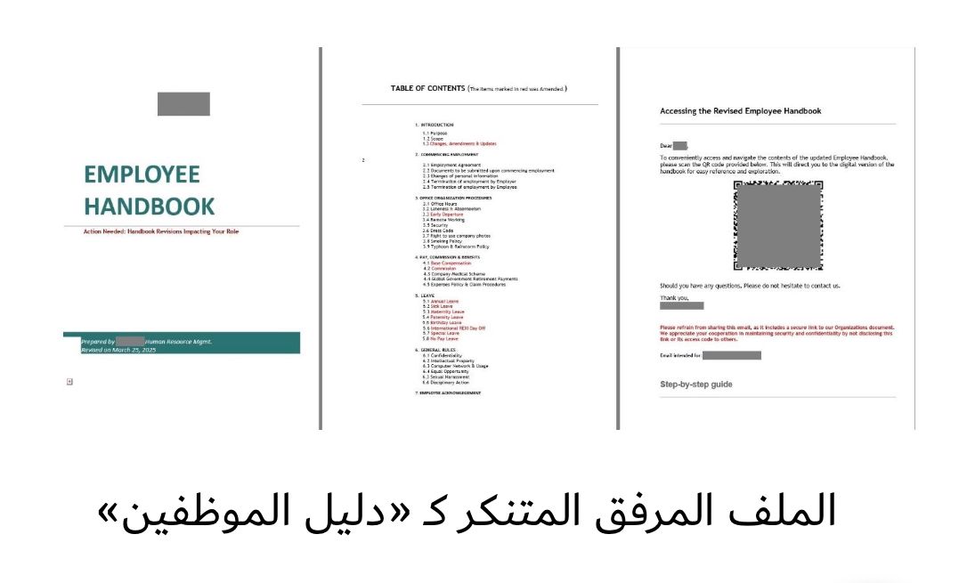المستند المرفق المتنكر كنسخة محدثة من «دليل الموظفين»، لا يحتوي على أي توجيهات حقيقية – فقط صفحة غلاف، وفهرس مع بنود يُزعم أنها خضعت للتحديث، مميزة باللون الأحمر، وصفحة بها رمز QR، يُفترض أنه للوصول للمستند الكامل وإرشادات عامة حول كيفية مسح رموز QR بالهاتف.