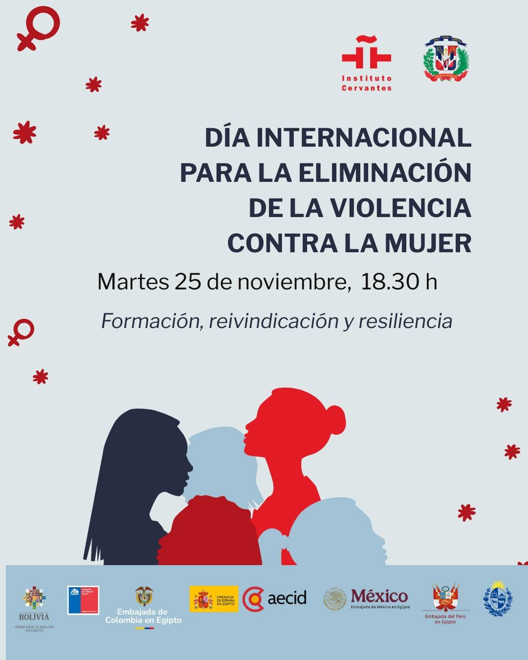يحتفل معهد ثربانتس بالقاهرة بالتعاون مع سفارة جمهورية الدومينيكان باليوم الدولي للقضاء على العنف ضد المرأة اليوم الثلاثاء 25 نوفمبر في مقر المعهد بالقاهرة الساعة السادسة والنصف مساءً الفعالية مفتوحة للجمهور والدخول مجاني حتى اكتمال العدد.
