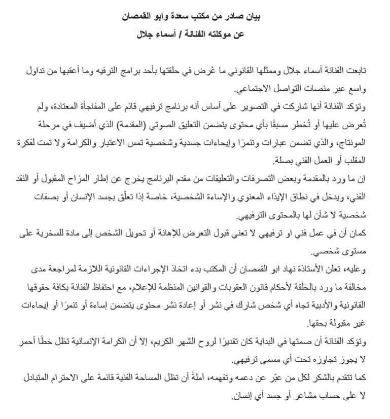 ان ما ورد بالمقدمة وبعض التصرفات والتعليقات من مقدم البرنامج يخرج عن إطار المزاح المقبول أو النقد الفني ويدخل في نطاق الإيذاء المعنوي والإساءة الشخصية خاصة إذا تعلّق بجسد الإنسان أو بصفات شخصية لا شأن لها بالمحتوى الترفيهي.